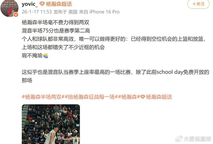 面对杨瀚森这样的表现,开拓者跟队记者yovic称赞到:“杨瀚森半场毫不费力得到两双,混音半场75分也是赛季第二高。
